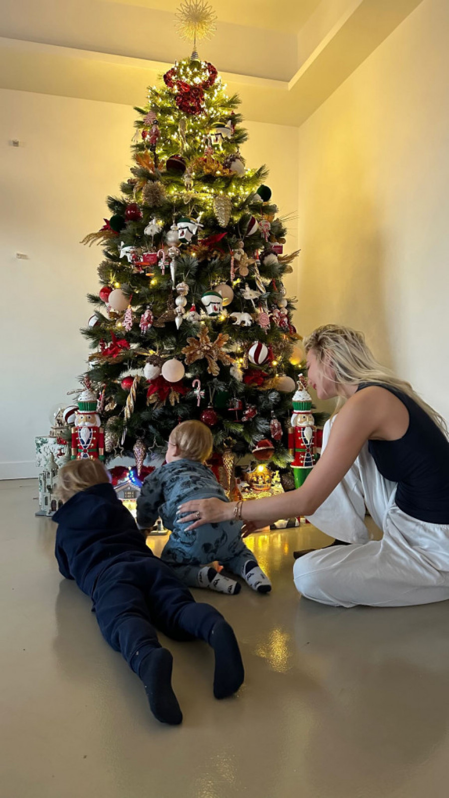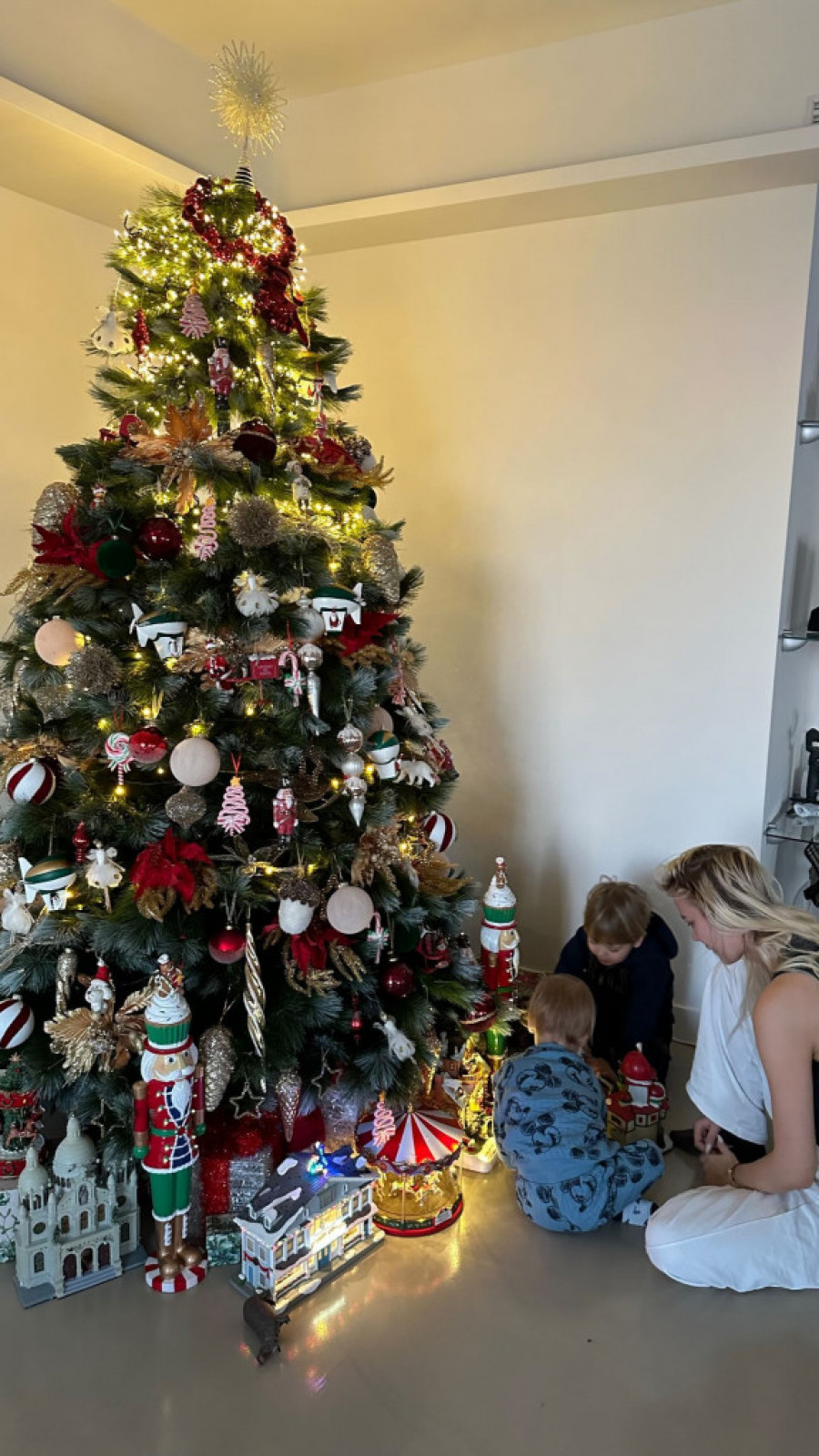 Sofijini sinovi Aleksej i Teodor ne odvajaju se od šarenog drveta, koje će, bez sumnje, narednih nedjelja biti centar sveta u kući. Ovo je i retka prilika da plavokose dečake vidimo zajedno na fotografijama, a mama im se često pridruži u igri pored jelke.