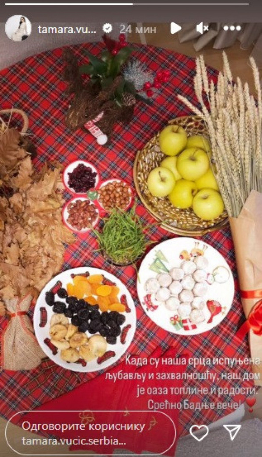 Naime, kako smo mogli da vidimo na fotografiji koju je objavila na društvenoj mreži Instagram, na prazničnom stolu našao se Badnjak, suvo voće, jabuke, posni kolači i božićna pšenica koja je jedna od najvažnijih prazničnih stavki.
