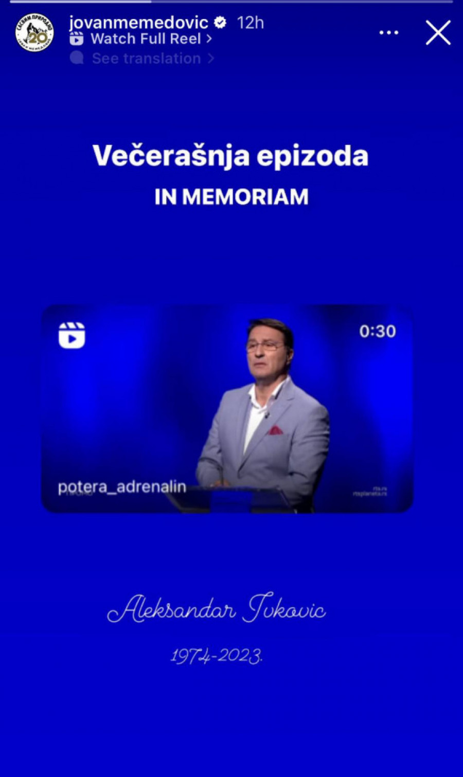 Aleksandar je, nažalost, preminuo u periodu od snimanja do emitovanja epizode, koja je sinoć prikazana na Radio-televiziji Srbije, a Memedović se oprostio na svom profilu.