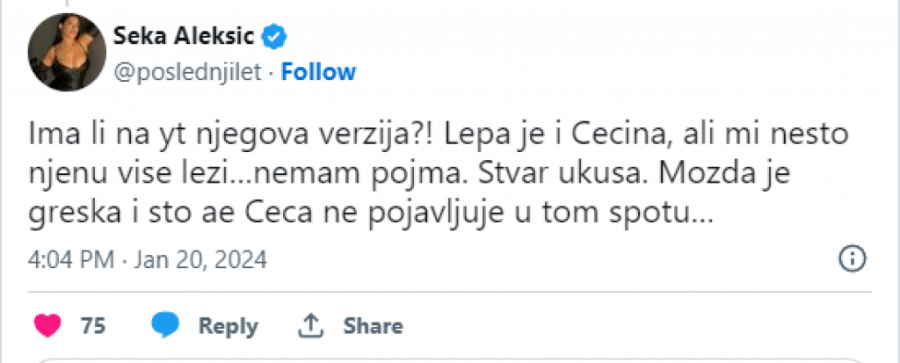 - Ima li na Jutjubu njegova verzija? Lepa je i Cecina, ali mi nešto njena više leži… nemam pojma. Stvar ukusa. Možda je greška i što se Ceca ne pojavljuje u tom spotu… - navela je pevačica.