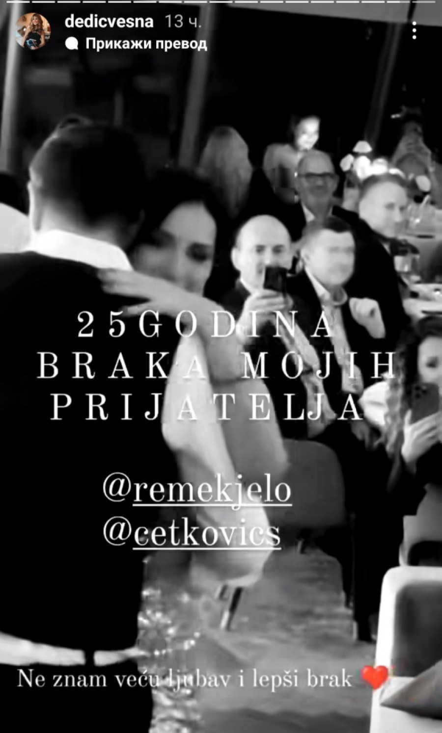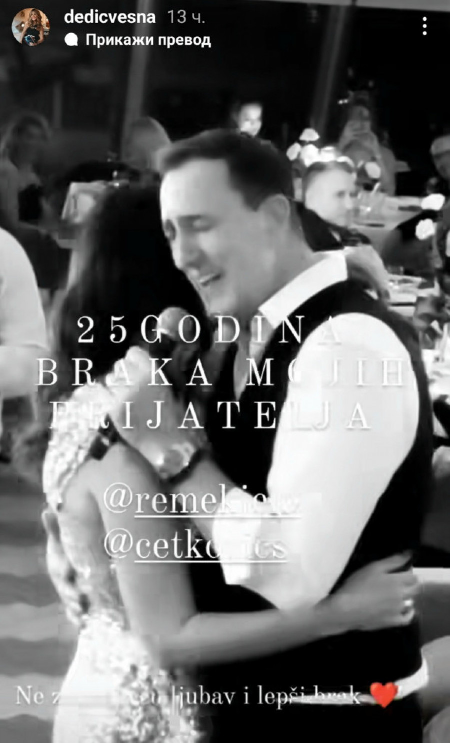 Povodom prvih četvrt veka od trenutka kada su izgovorili sudbonosno "da" par je priredio gala slavlje na jednom lepom mesu u Beogradu. Gosti su bili odabrani – porodica, prijatelji, poznata lica iz javnog života, a među njima i Vesna Dedić, koja je zabeležila najemotivniji trenutak.