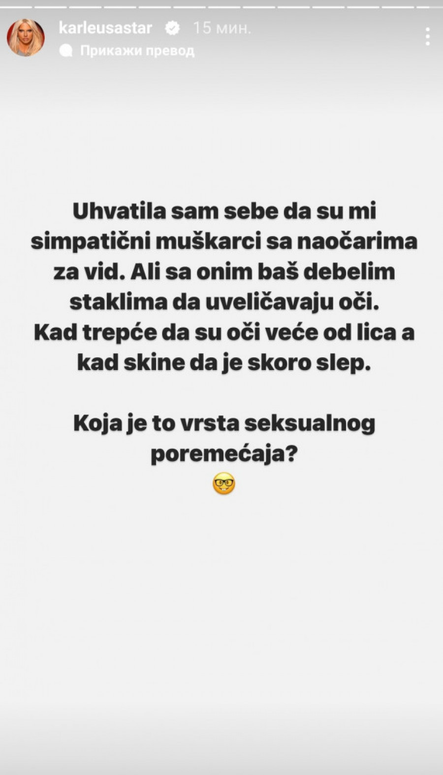 „Uhvatila sam sebe da su mi simpatični muškarci s naočarima za vid. Ali sa onim baš debelim staklima da uveličavaju oči. Kad trepće da su oči veće od lica, a kad skine da je skoro slep. Koja je to vrsta seksualnog poremećaja?”, zapitala se JK u objavi.