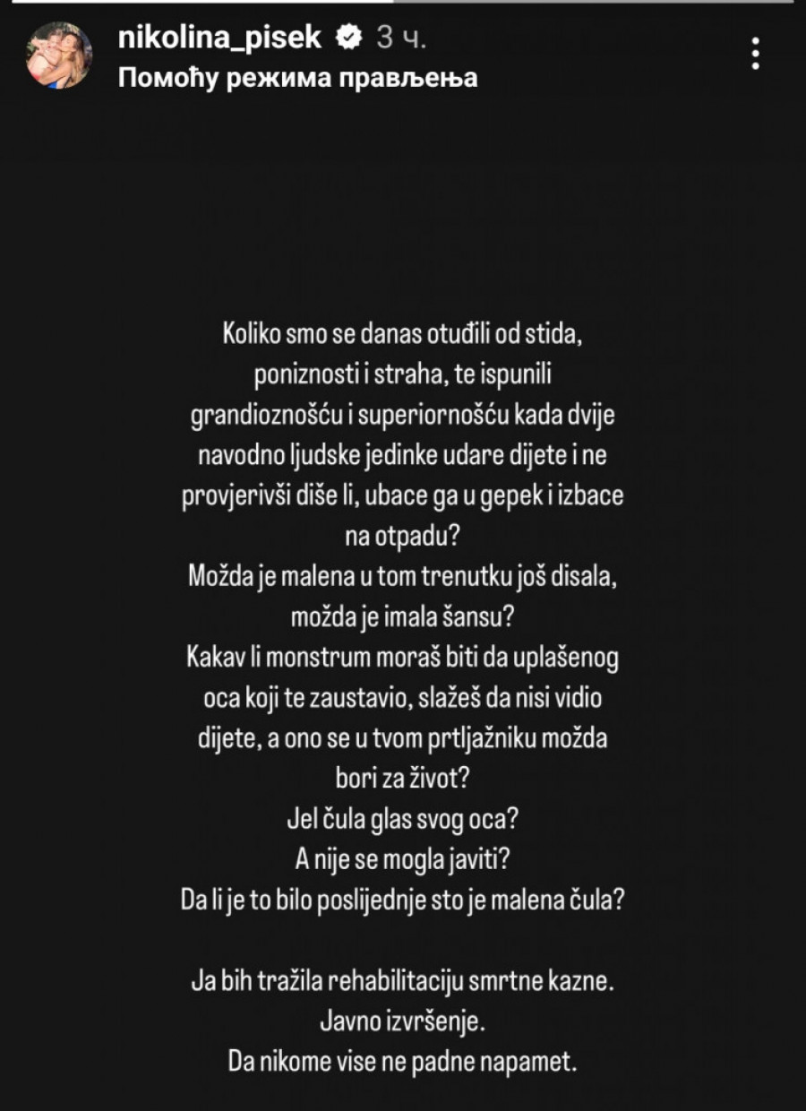 „Koliko smo se danas otuđili od stida, poniznosti i straha, te ispunili grandioznošću i superiornošću kada dve navodno ljudske jedinke udare dete i ne provere diše li, ubace ga u gepek i izbace na otpadu? Možda je malena u tom trenutku još disala, možda je imala šansu?”, napisala je Nikolina, i boli svaka reč.