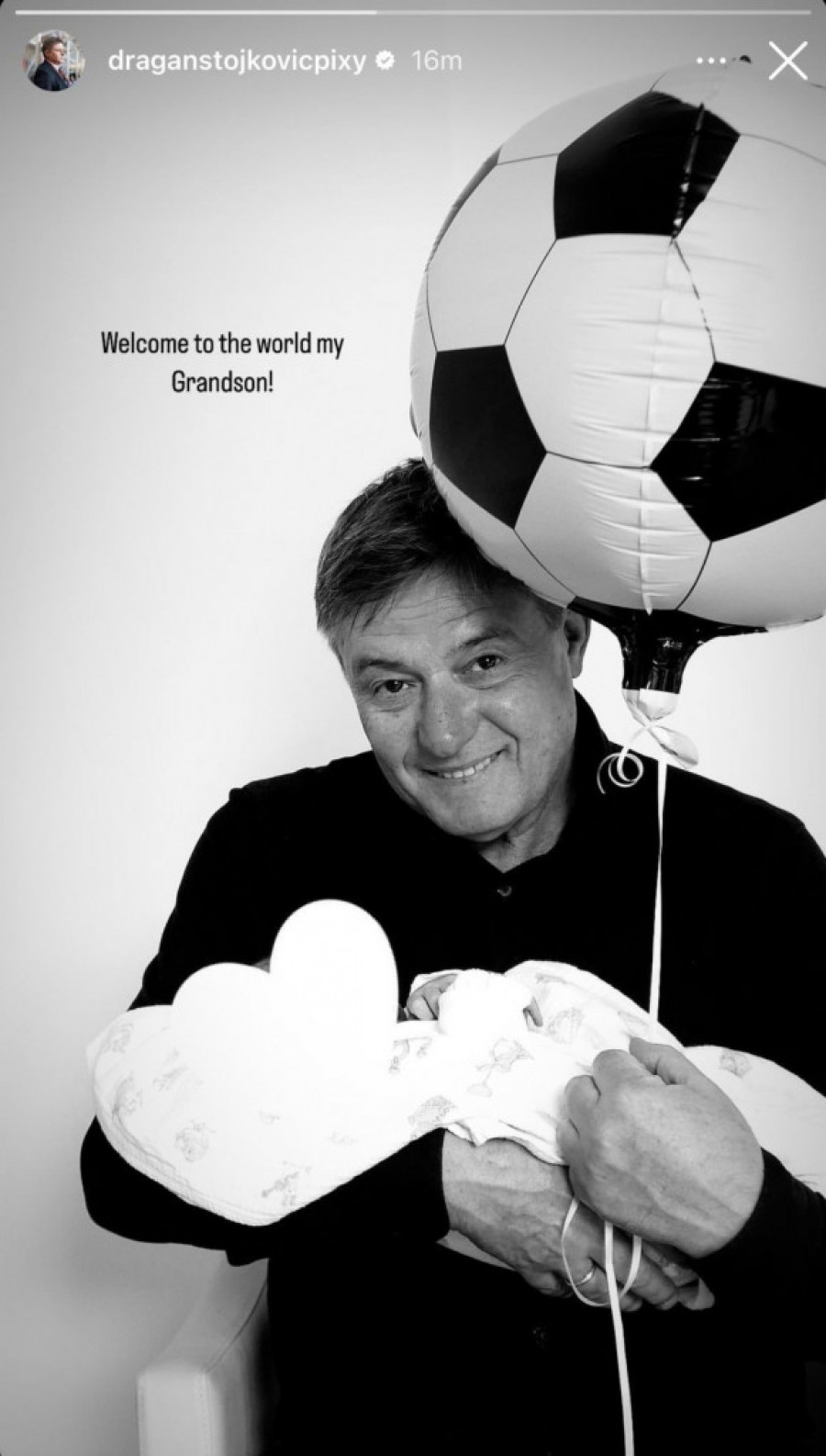„Dobro došao na svet, moj unuče“, napisao je Stojković uz sliku sa bebom koju nežno drži u naručju, a tu je i balon - ovog puta u obliku fudbalske lopte.