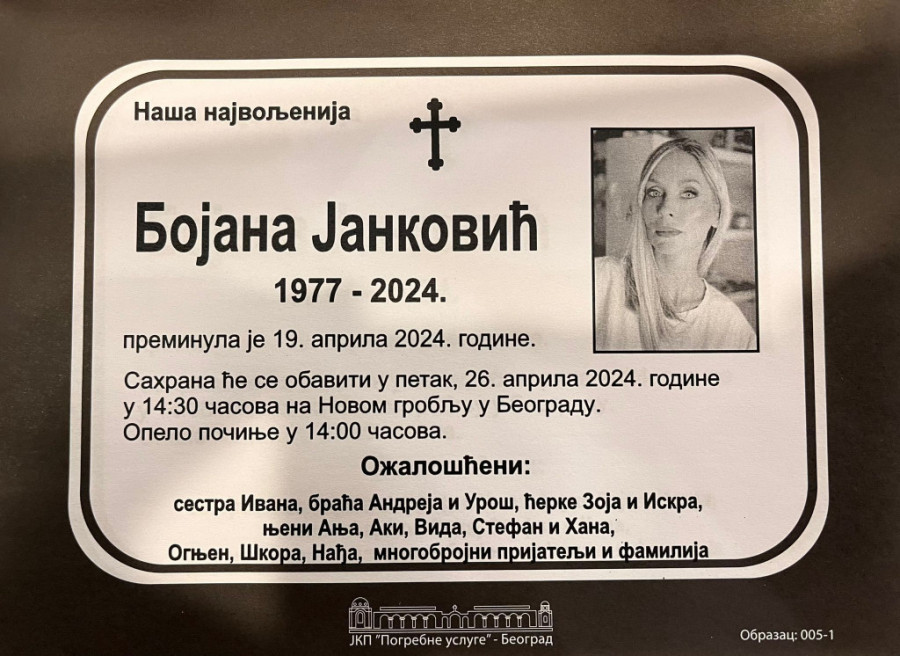 Porodica Bojane Janković danas je objavila umrlicu u kojoj se navode vreme i mesto sahrane.