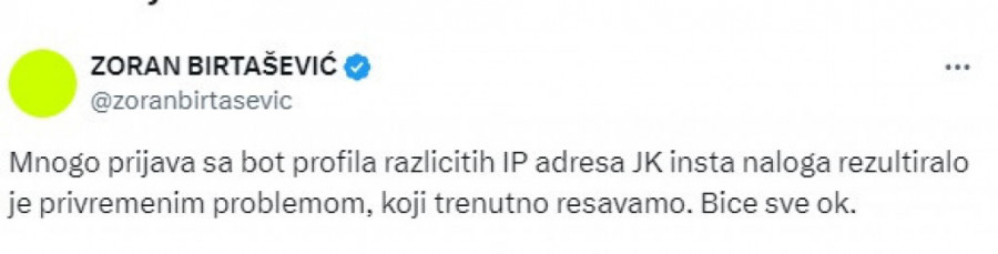 - Mnogo prijava sa bot profila različitih IP adresa JK insta naloga rezultiralo je privremenim problemom, koji trenutno rešavamo. Biće sve ok - napisao je Birtašević i bar nakratko smirio zabrinute fanove.