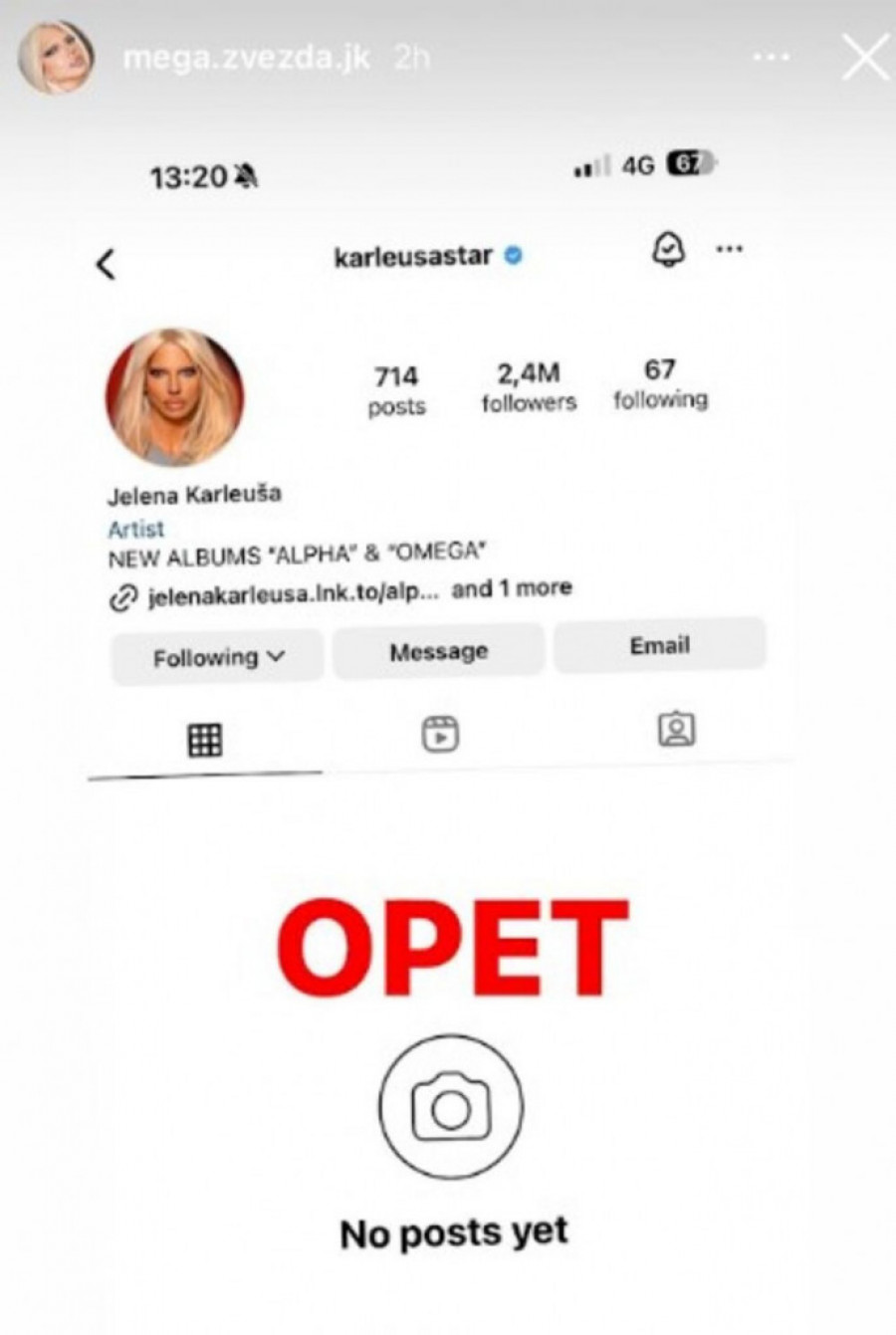 Po svemu sudeći, pop diva Jelena Karleuša ostala je bez Instagram naloga, a njena publika tokom celog dana vidno je zabrinuta i ostavlja komentare na društvenim mrežama ispod objava fan stranica pevačice.