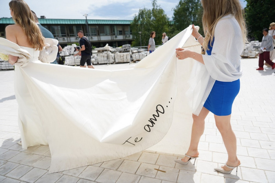 Poznati harmonikaš pojavio se u crnom odelu, dok je mlada na šlepu raskošne venčanice na italijanskom jeziku nosila romantičnu poruku na kojoj je pisalo „Volim te”.