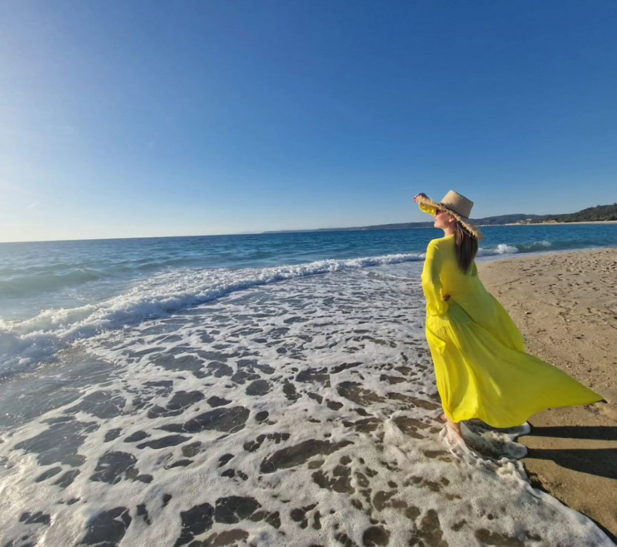 Prošetala je i prelepom peščanom plažom. Ovog puta nije imala bikini, već dugu svetlozelenu haljinu i slamnati šešir sa širokim obodom.