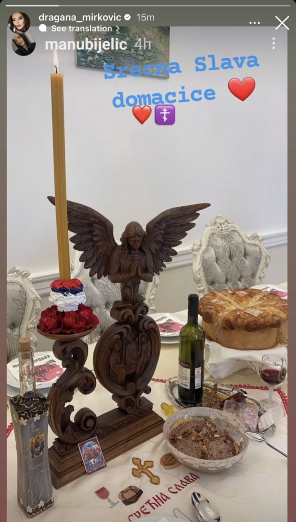 Ona se takođe oglasila na Instagramu, uz fotografiju slavske trpeze na kojoj pored već pomenutog sadržaja vidimo žito i vino, a tu je i čestitka: "Srećna slava, domaćice".