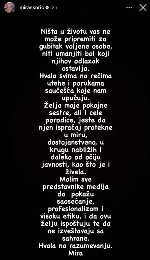 “Želja moje pokojne sestre, ali i cele porodice, jeste da njen ispraćaj protekne u miru, dostojanstveno, u krugu najbližih i daleko od očiju javnosti, kao što je i živela.”