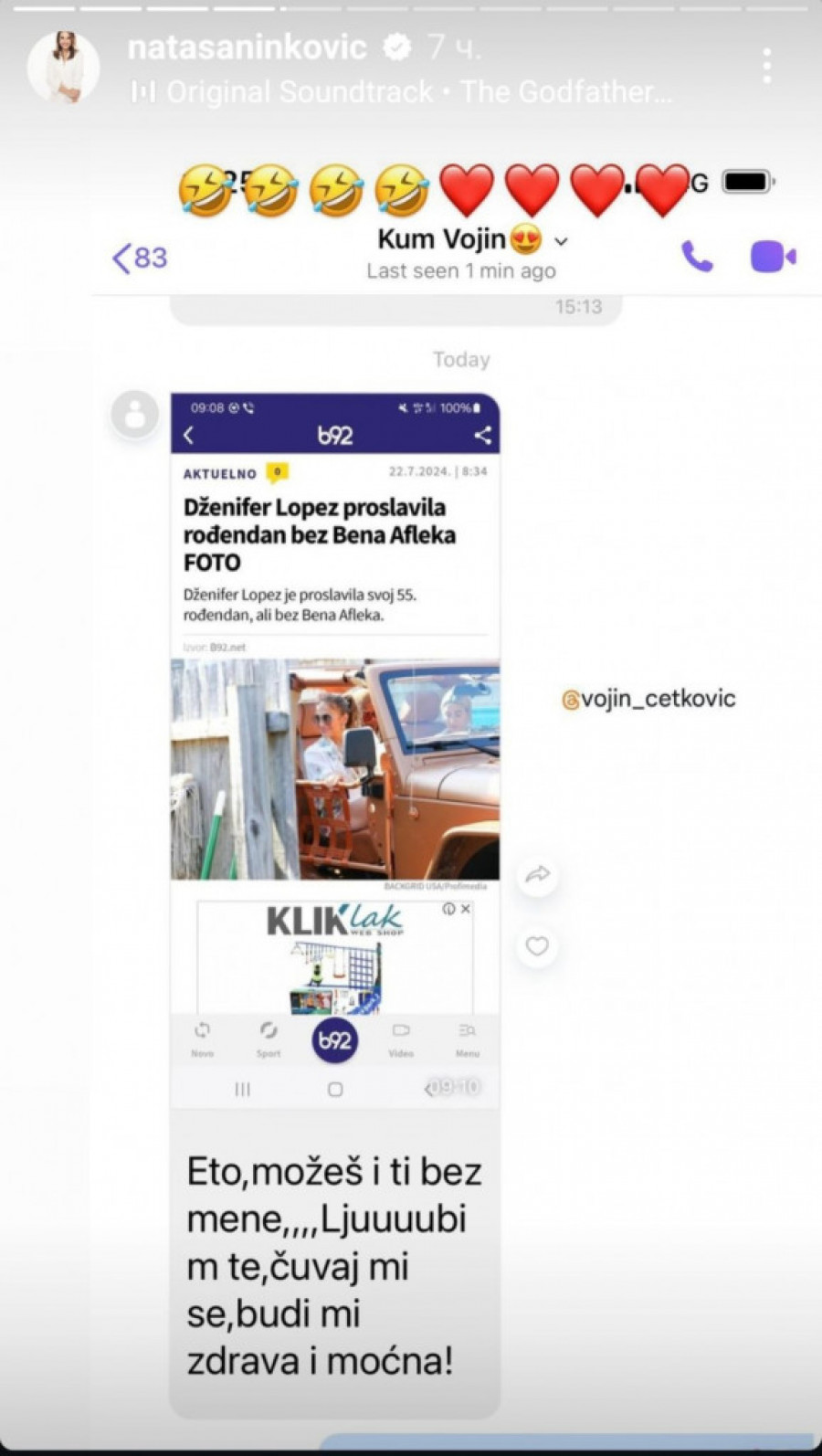 Vojin ju je uporedio sa svetskom zvezdom Dženifer Lopez, koja i sama proslavlja rođendan ovih dana, a Nataša Ninković nije odolela da ne podeli poruku.