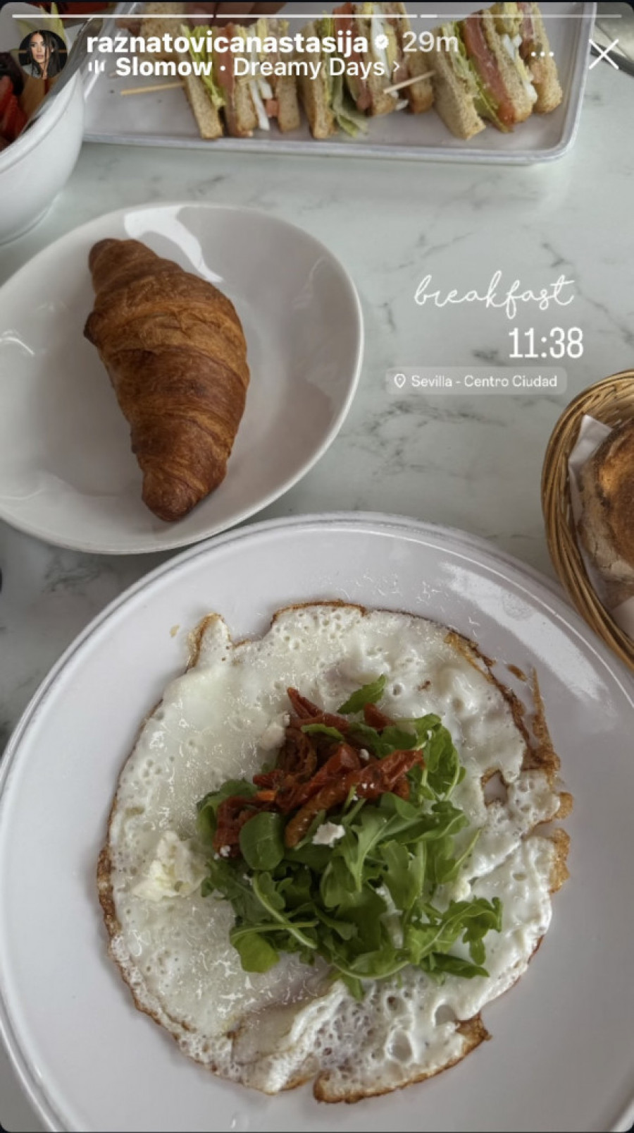 Na stolu su jaja na oko, kroosani, klub sendviči, prženice, a kako je navela u opisu fotografije u pitanju je kasni obrok, koji je sve iznenadio, s obzirom na to da je prilično obiman, dok Anastasija već duži niz godina nema ni gram viška.