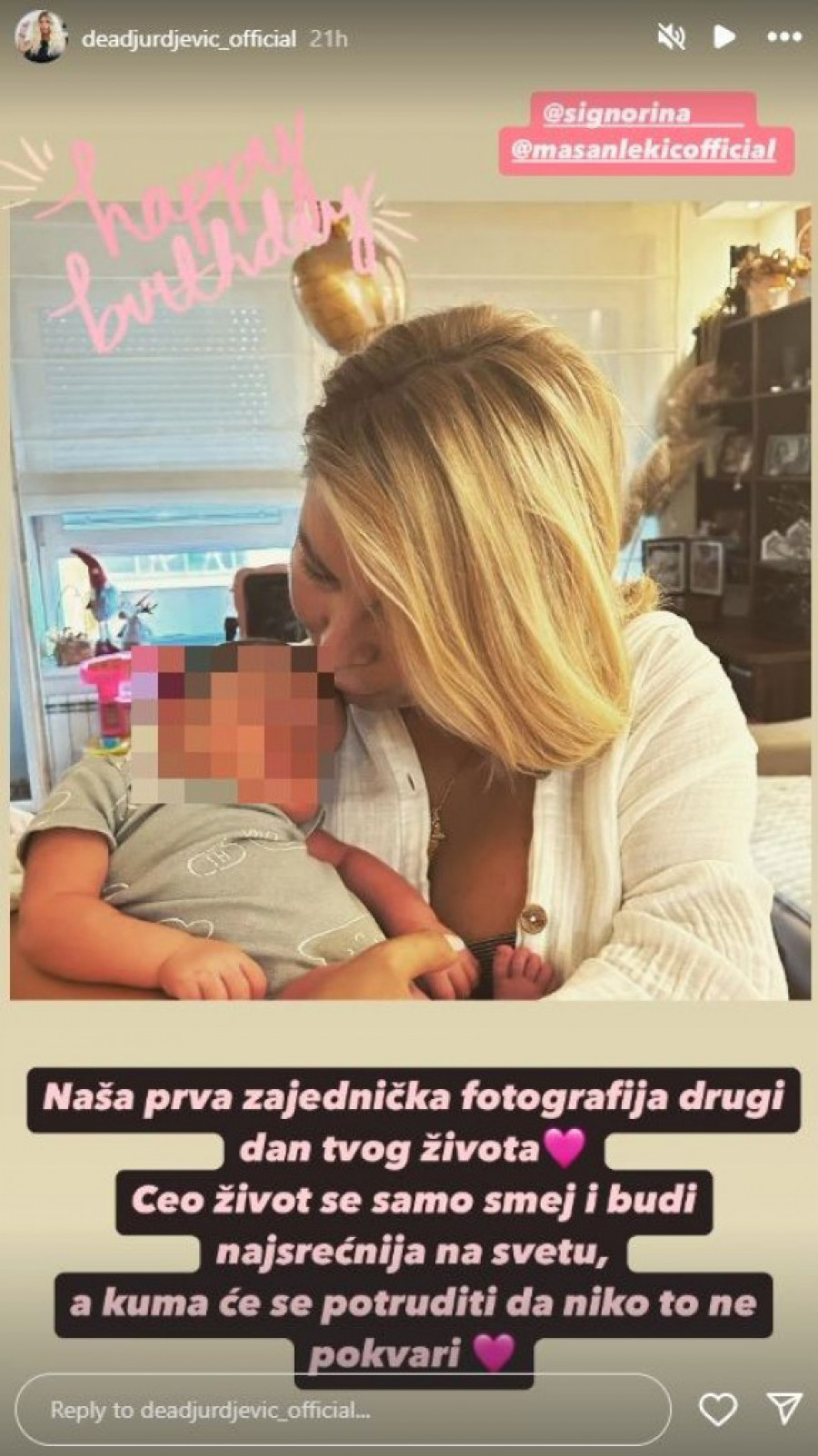 - Naša prva zajednička fotografija, drugi dan tvog života. Ceo život se samo smej i budi najsrećnija na svetu,a kuma će se potruditi da to niko ne pokvari - napisala je Dea Đurđević u opisu dirljive fotografije preslatke devojčice koju je kuma Dea držala u naručju, a gotovo niko nije ostao ravnodušan na prizor.