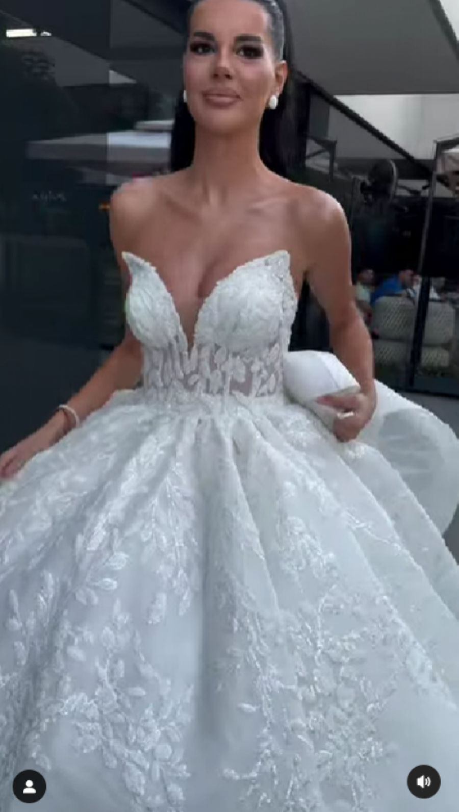 Misica se odlučila za venčanicu u balskom stilu, a svoju dugu kosu podigla u talasasti rep, dok je njen dekolte bio u prvom planu.