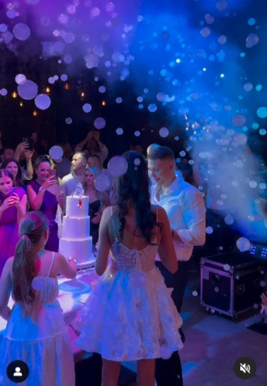 Mladenci su đuskali zajedno sa gostima, dok su balončići prekrili celu salu, a na raskošnoj torti bili su urezani inicijali u crnoj boji.