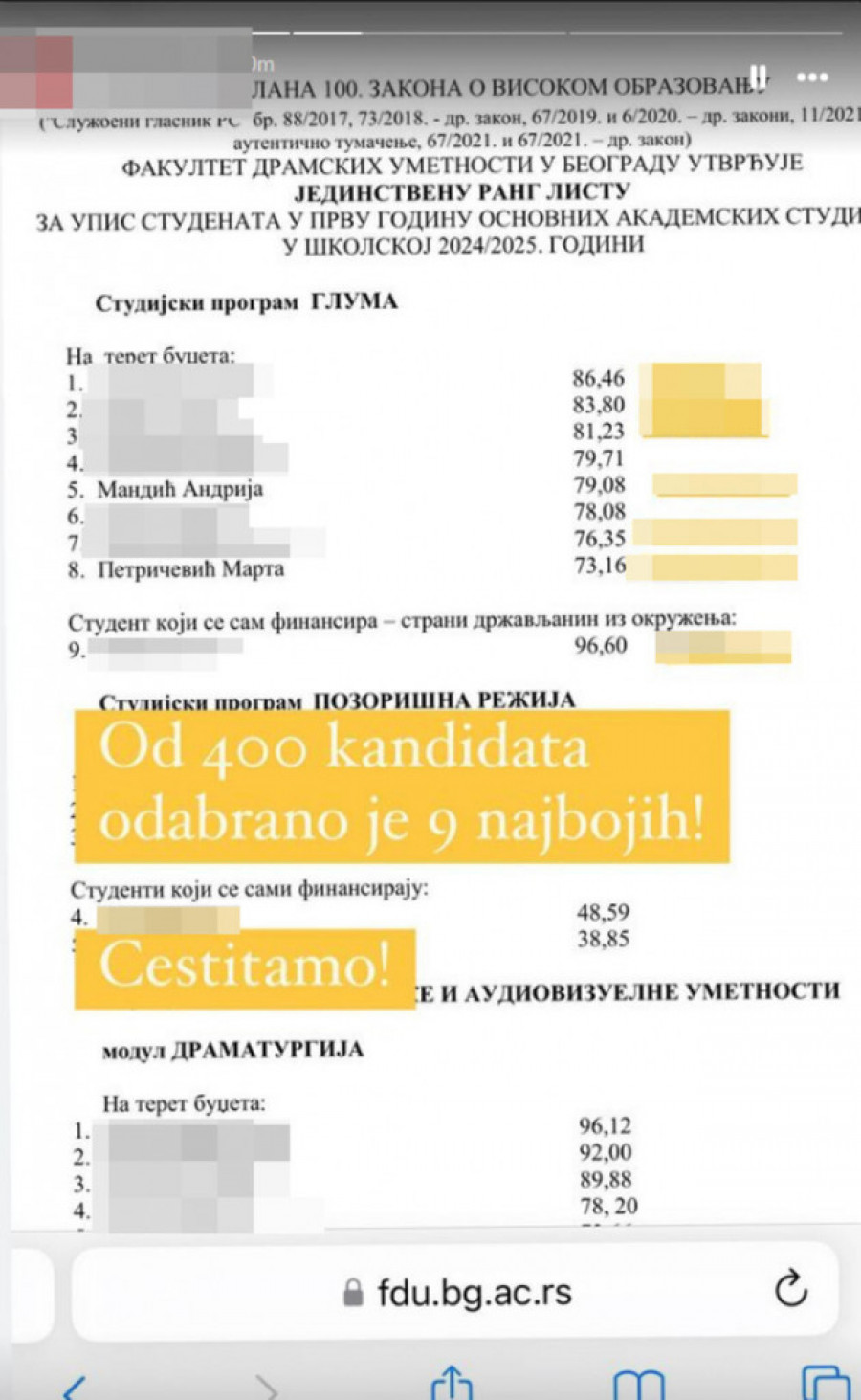 Naime, ovog leta je Andrija Mandić upisao Fakultet dramskih umetnosti, smer gluma, u klasi profesorke Marije Milenković, dok će mu koleginica i prijateljica sa studija biti Marta Petričević, ćerka Nele Mihailović.