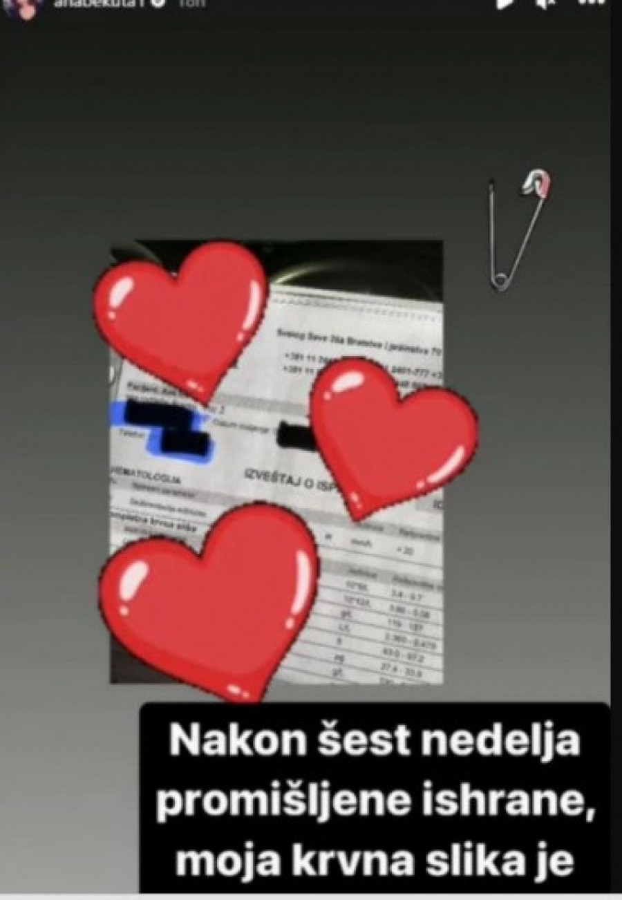 Da je zdravlje Ane Bekute sada savršeno pevačica je otkrila na Instagramu objavivši rezultate krvne slike koju je korekcijom unosa namirnica uspela da vrati gotovo na staro stanje.