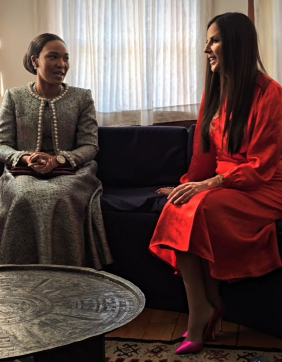 Obe dame su plenile elegancijom. Tamara Vučić je za ovu priliku izabrala svedenu crvenu haljinu sa puf rukavima, sandale pink nijanse i diskretan nakit. Kraljica Lazuma nosila je svetlosivu haljinu A-kroja, uz kraći sako ukrašen biserima.