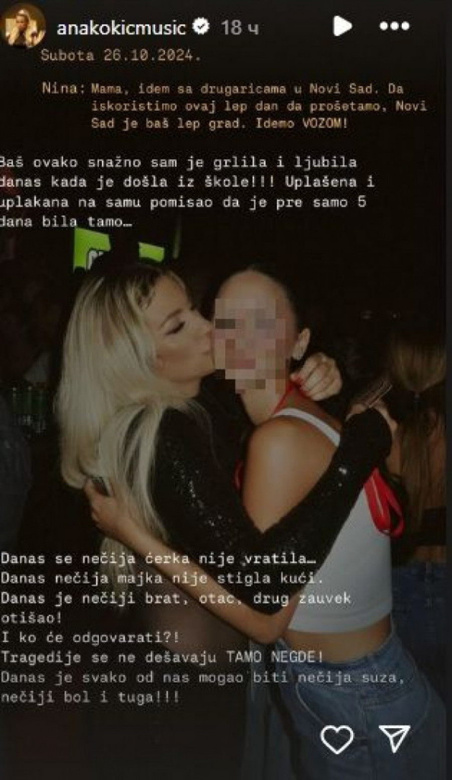 Pevačica Ana Kokić oglasila se na društvenim mrežama, podelivši fotografiju svoje ćerke Nine koja je pre samo pet dana bila na mestu nesreće u Novom Sadu.