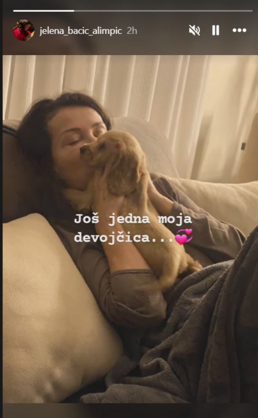 Naime, fotografija Jelene Bačić Alimpić pokazala nam je kako ona uživa sa novim članom njihove porodice, kućnim ljubimcem psom ženkicom čije ime nije otkrivala, već je samo napisala "Još jedna moja devojčica".