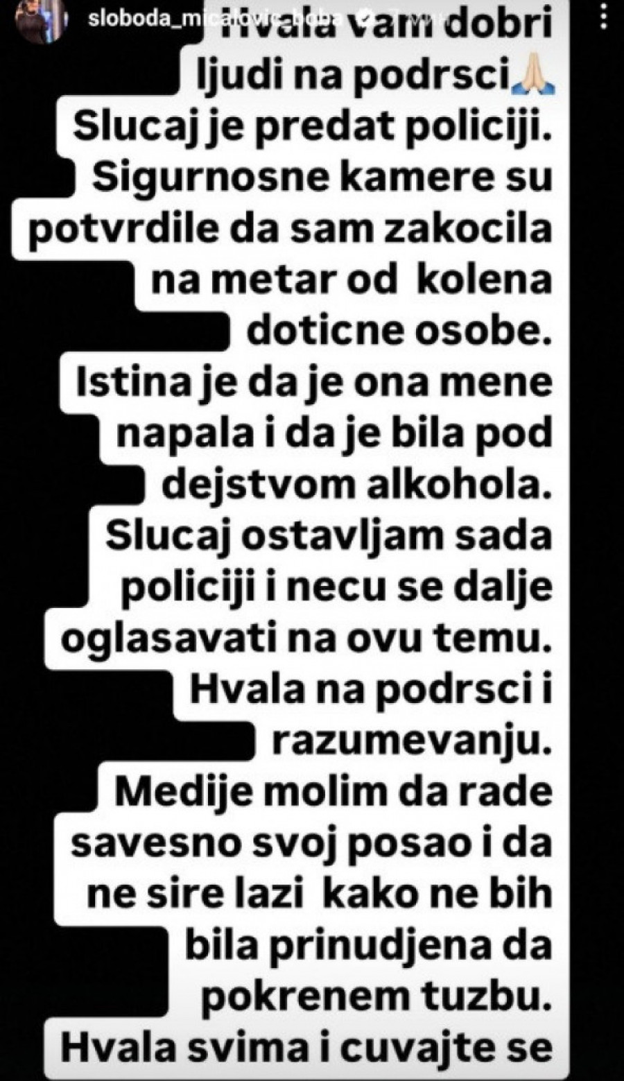 - Istina je da me je napala i da je bila pod dejstvom alkohola. Sada prepuštam slučaj policiji i neću se oglašavati dalje po ovom pitanju - napisala je Sloboda, obrisala saopštenje, a onda se ponovo oglasila.