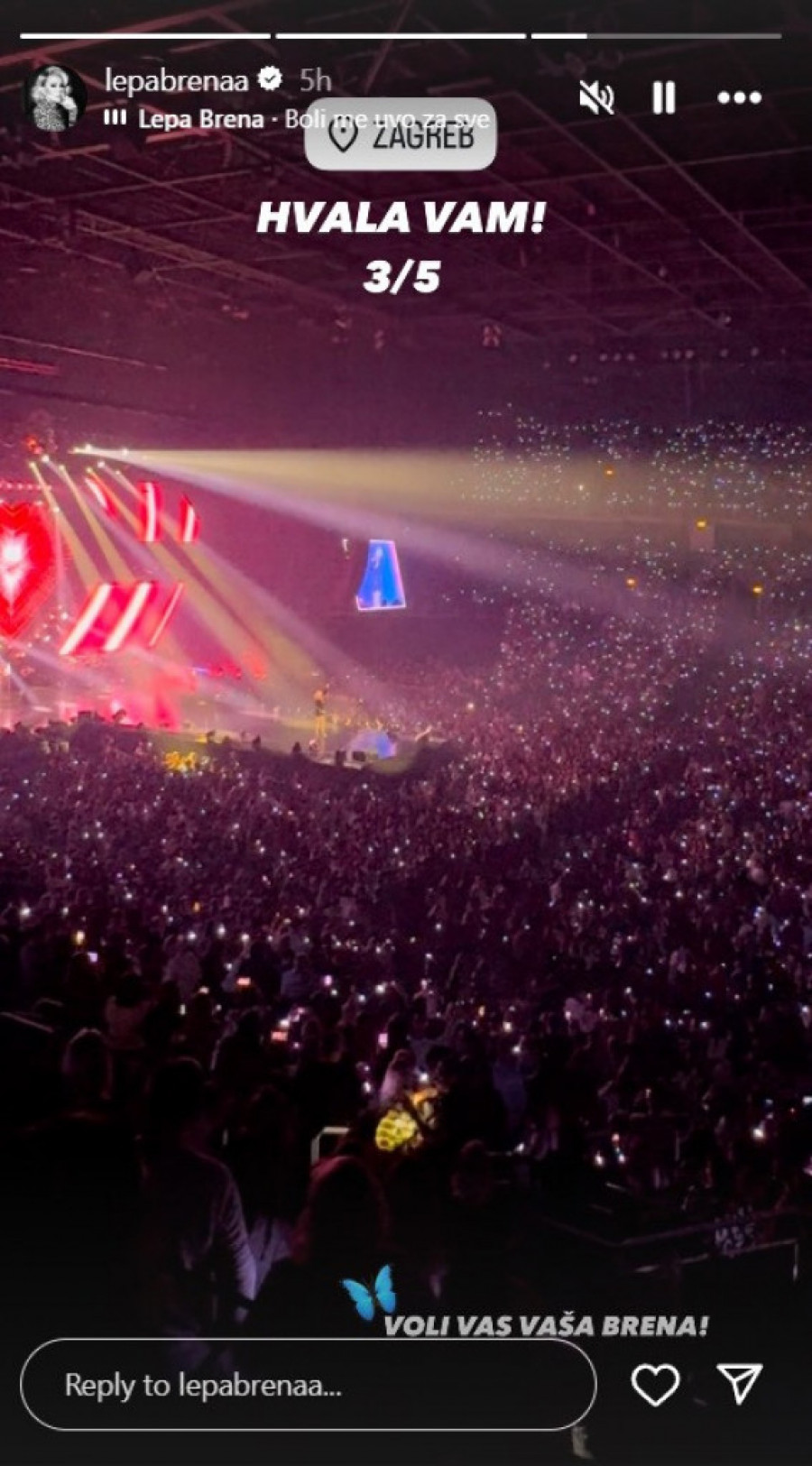 I pored povrede koju je doživela Brena se oglasila na svom Instagramu, te je zahvalila svojoj publici za magično veče, podelivši sliku iz prepune Arene.