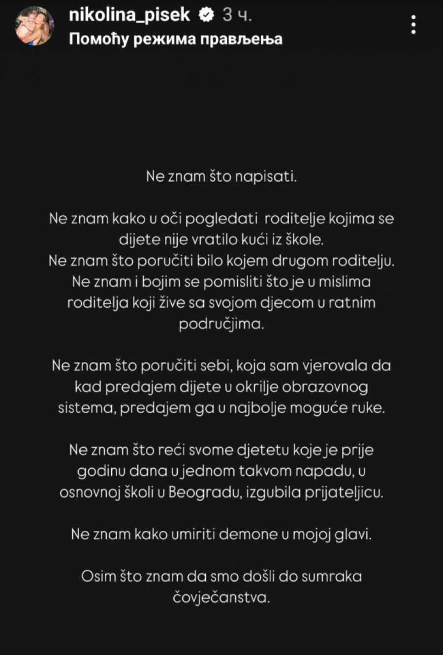“Ne znam šta napisati. Ne znam kako u oči pogledati roditelje kojima se dete nije vratilo kući iz škole. Ne znam šta poručiti bilo kom drugom roditelju. Ne znam i bojim se pomisliti šta je u mislima roditelja koji žive sa svojom decom u ratnim područjima. Ne znam šta poručiti sebi, koja sam verovala da kad predajme dete u okrilje obrazovnog sistema, predajem ga u najbolje moguće ruke,” napisala je Nikolina Pišek.