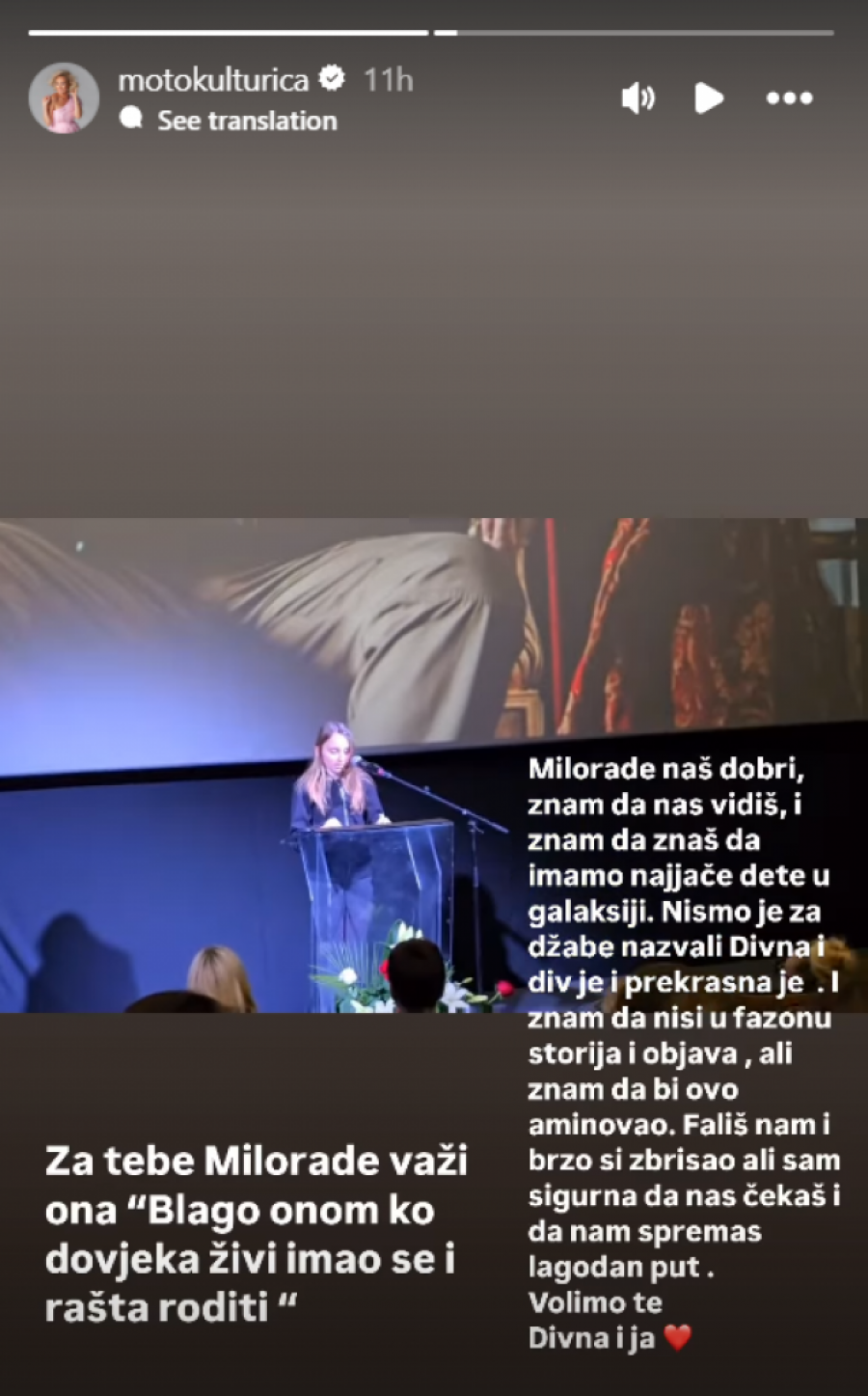 Za tebe, Milorade važi ona "Blago onom ko dovjeka živi imao se rašta i roditi" - napisala je glumica uz snimak ćerke koja čita govor na komemoraciji.