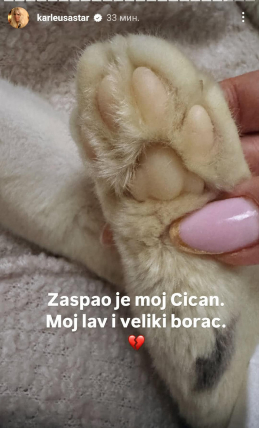- Zaspao je moj Cican, moj lav i veliki borac - napisala je Jelena uz fotografiju šapice mačora koji je godinama bio član porodice.