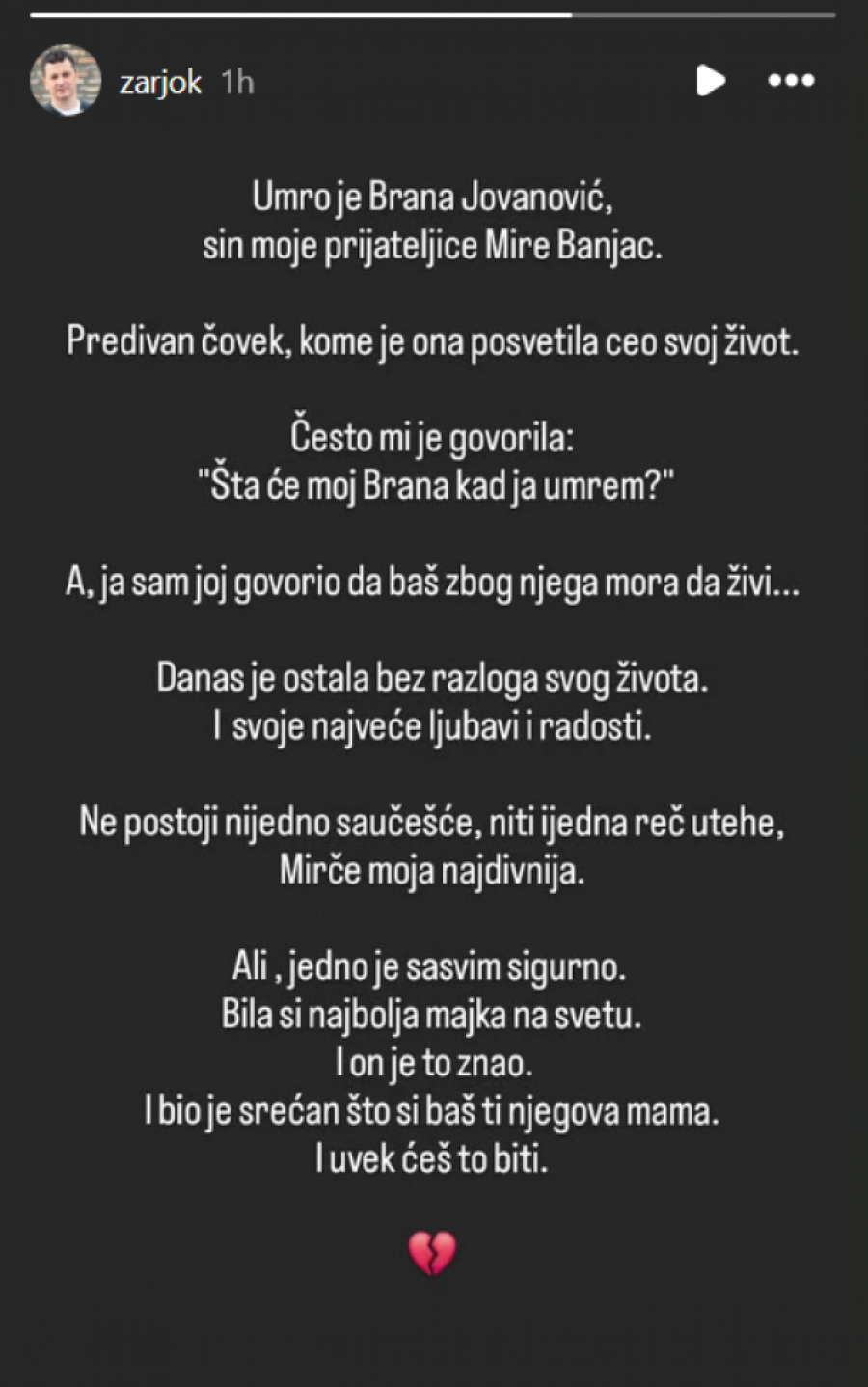 - Umro je Brana Jovanović, sin moje prijateljice Mire Banjac. Predivan čovek, kome je ona posvetila ceo svoj život. Često mi je govorila "Šta će moj Brana kada ja umrem?"