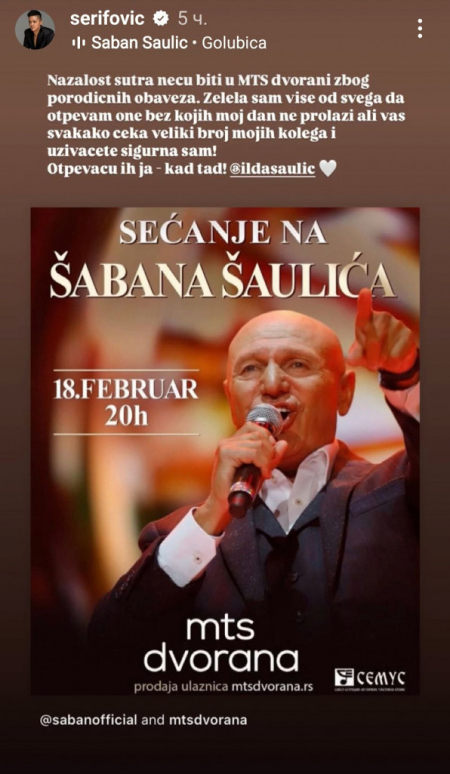 Nažalost, sutra neću biti u MTS dvorani zbog porodičnih obaveza. Želela sam više od svega da otpevam one pesme bez kojih moj dan ne prolazi, ali vas svakako čeka veliki broj mojih kolega. Sigurna sam da ćete uživati. Otpevaću ih i ja, kad- tad – napisala je Marija na svom Instagram profilu.