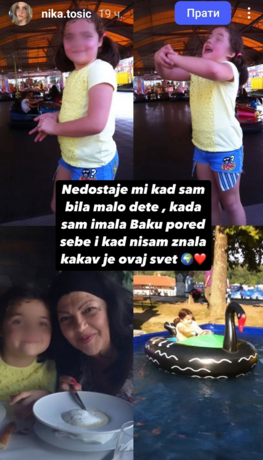 - Nedostaje mi kad sam bila malo dete, kad sam imala baku pored sebe i kada nisam znala kakav je ovaj svet – poručila je Nika Tošić uz kolaž fotografija na kojima je sa bakom.