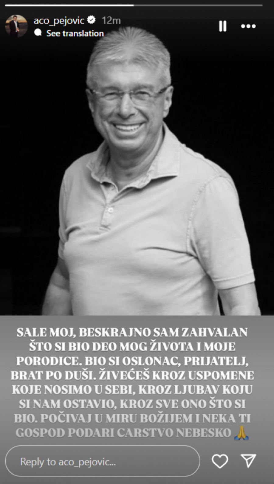 - Sale moj, beskrajno sam zahvalan što si bio deo mog života i moje porodice. Bio si oslonac, prijatelj, brat po duši. Živećeš kroz uspomene koje nosimo u sebi i kroz sve ono što si bio, kroz ljubav koju si nam ostavio.