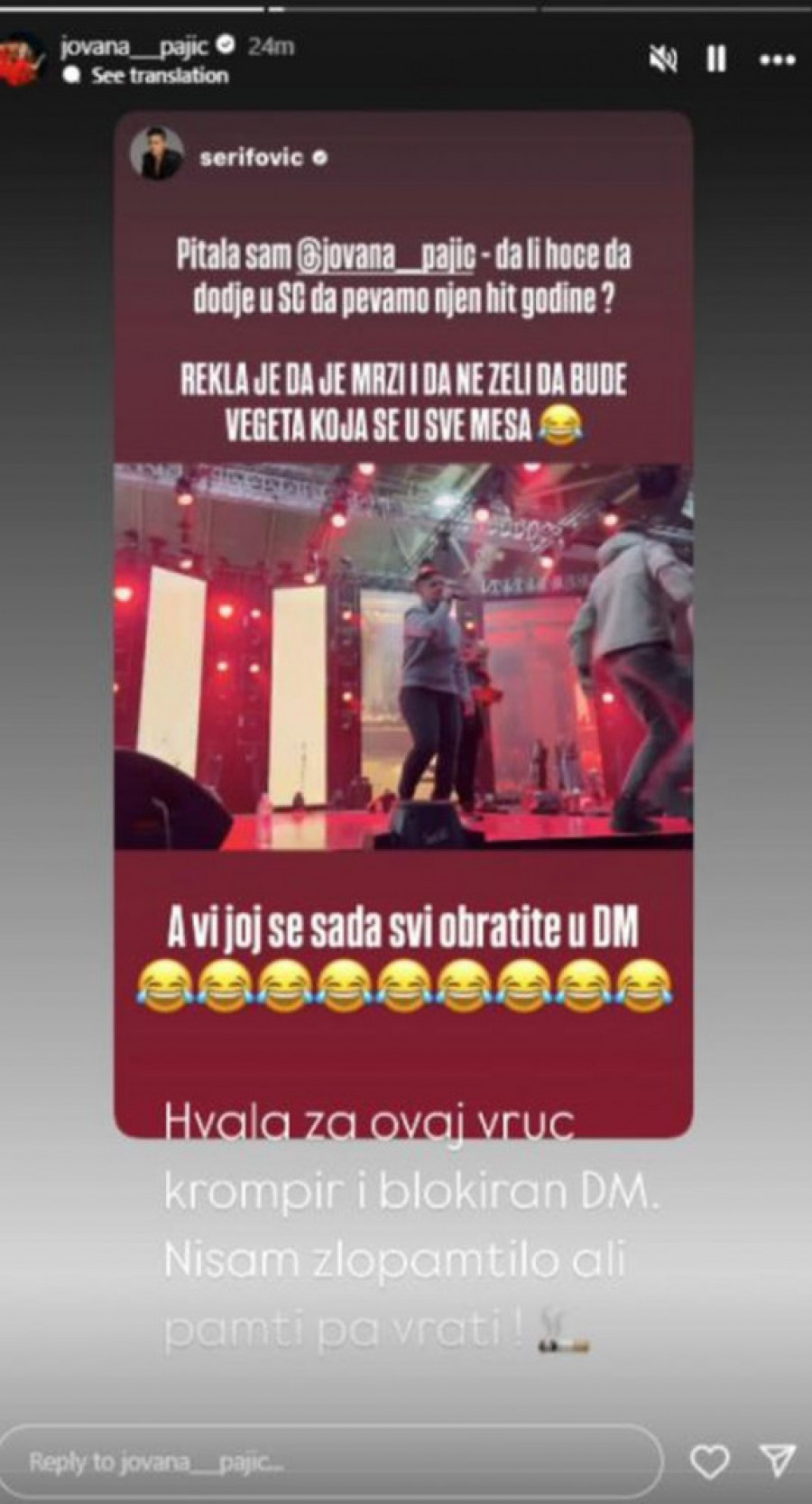 Marija je objasnila pratiocima na Instagramu da je pitala Jovanu da joj se pridruži na bini da zajedno otpevaju hit "Ludilo moje". Jovana joj je međutim, odgovorila da "je mrzi i da ne želi da bude vegeta koja se u sve meša".