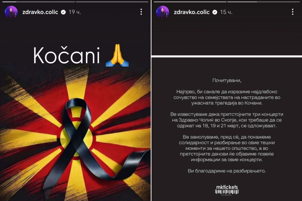 Pevač je prvo objavio priču na društvenoj mreži Instagram sa kratkom porukom “Kočani” i emotikonom sklopljenih dlanova, izražavajući time tugu i solidarnost.