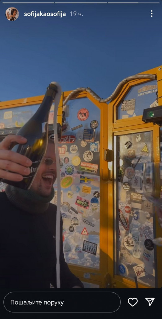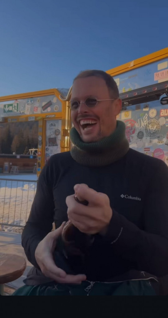 Na jednom od snimaka koje je podelila supruga Igora Kojića vidi se kako on na ski stazi otvara bocu šampanjca i toči, dok su oko njega žamor, smeh i vesela atmosfera.