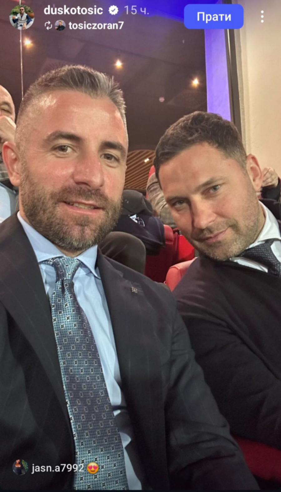 Zejednički selfi napravili su u loži stadiona, a mnogima nije promaklo da su se za tu priliku posebno dotarali – obojica su obukli odelo i stavili kravate.