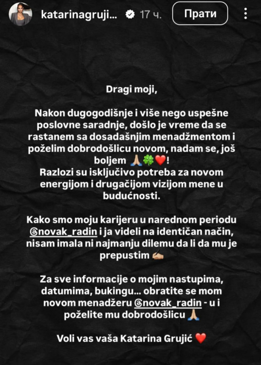 - Kako smo moju karijeru u narednom periodu Novak Radin i ja videli na identičan način nisam imala ni najmanju dilemu da li da mu je prepustim. Za sve informacije o mojim nastupima, datumima, bukingu… Obratite se mom novom menadžeru i poželite mu dobrodošlicu. Voli vas vaša Katarina Grujić.