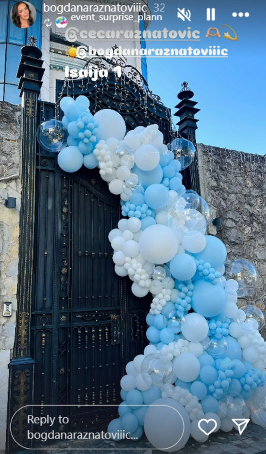 Ulaz u vilu u Ljutici Bogdana krasila je veličanstvena balonska dekoracija, u kombinaciji belih, plavih i providnih balona, koja se protezala duž kapije i stvarala utisak kao da ulazite u pravu bajku.