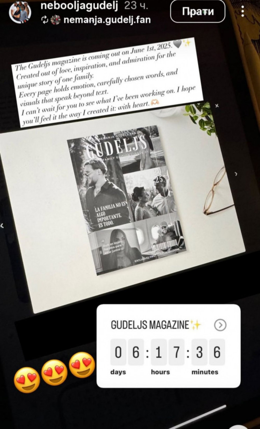 “Časopis "Gudelj" je nastao iz ljubavi, inspiracije i divljenja prema jedinstvenoj priči jedne porodice. Svaka stranica sadrži emocije, pažljivo odabrane reči i vizuelne prikaze koji govore više od reči. Jedva čekamo da vidite na čemu smo radili, nadam se da ćete to osetiti onako kako smo mi to stvarali srcem - stoji u zvaničnom saopštenju Olivere Gudelj.