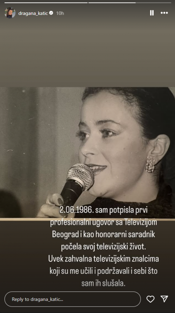 - 2. 06. 1986. sam potpisala prvi profesionalni ugovor sa Televizijom Beograd i kao honorarni saradnik počela svoj televizijski život. Uvek zahvalna televizijskim znalcima koji su me učili i podržavali i sebi što sam ih slušala - napisala je voditeljka.