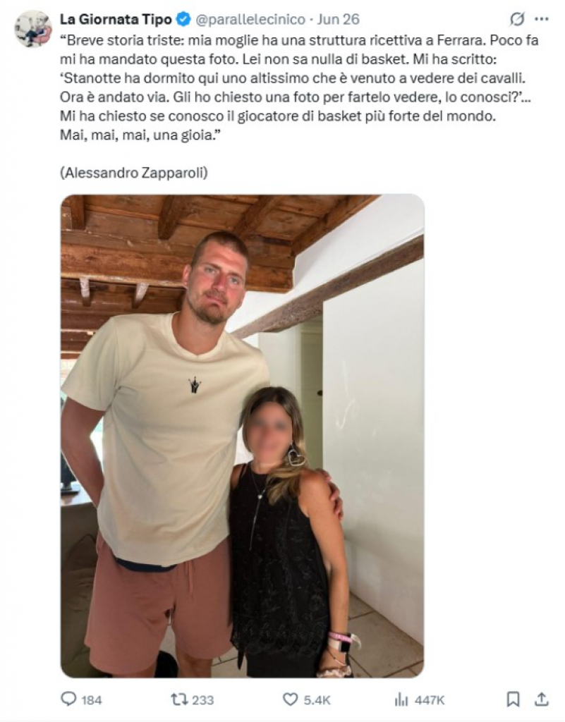 Ovih dana, srpski košarkaš Denver Nagetsa, Nikola Jokić na odmoru u Italji boravi u Ferari, gradu poznatom po eleganciji, istoriji i, izgleda, po slučajnim susretima koje prepričava cela Italija.