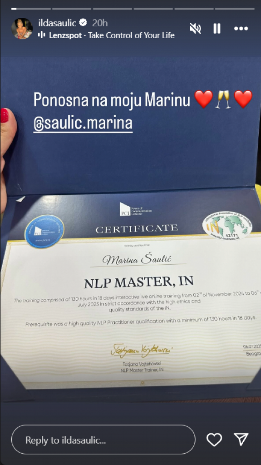 Time se pohvalila i njena zaova Ilda na Instagramu objavivši sliku sertifikata sa Marininim imenom i prezimenom, ne krijući da je veoma ponosna na snaju što je uspela da sa bebom od svega nekoliko meseci postigne ovakav uspeh.