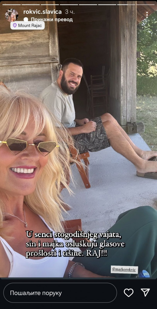 Uz osmeh i stihove pune emocije, Slavica je kratko napisala: "U senci stogodišnjeg vajata, sin i majka osluškuju glasove prošlosti i tišine. RAJ!!!"