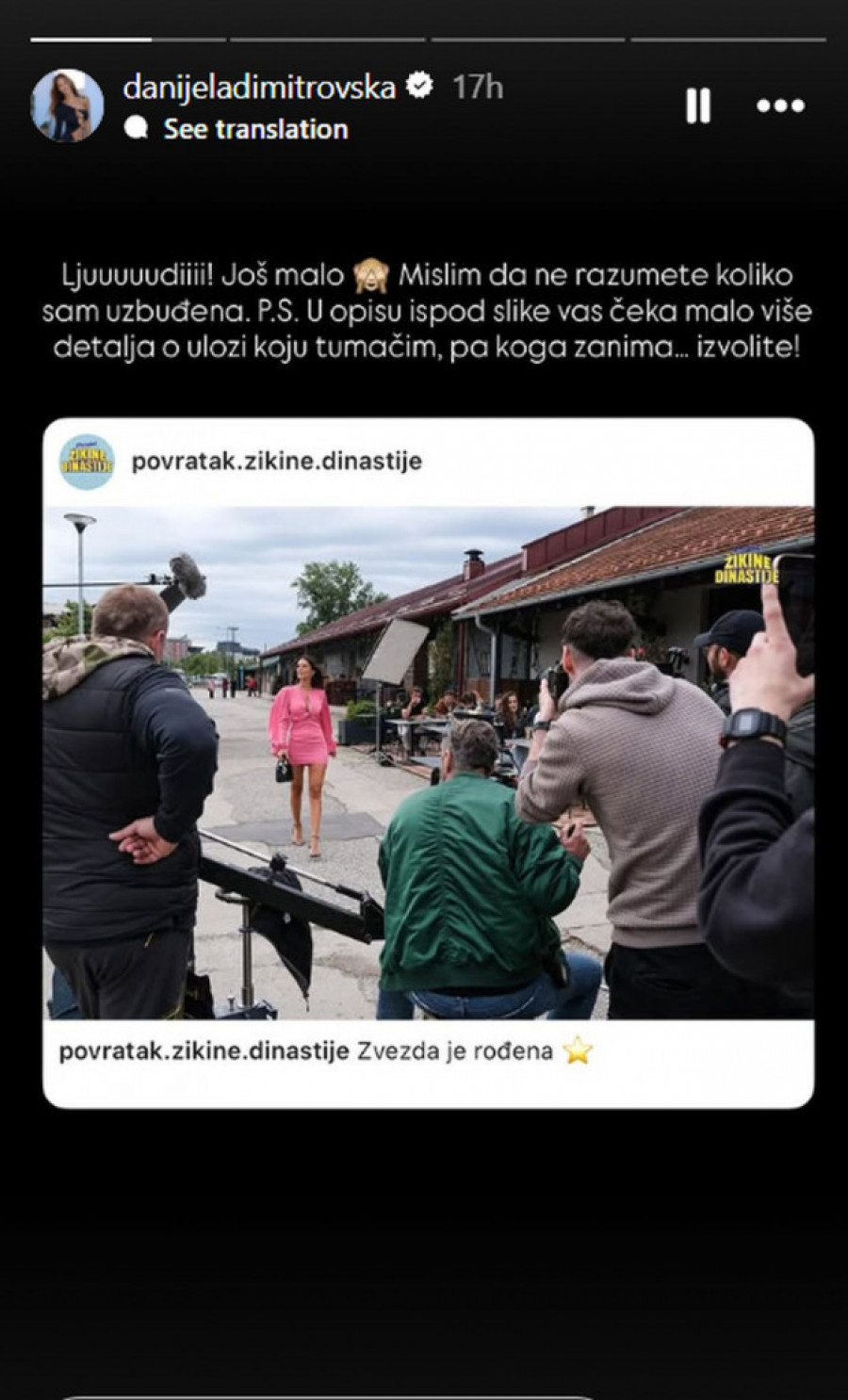 - Kada mi je ponuđena uloga u filmu “Povratak Žikine dinastije” moja reakcija je bila: Nema šanse. Ljudi završavaju fakultet za to, kako ću ja. Hvala reditelju Milanu Konjeviću i producentu Milanu Todoroviću na poverenju. Velika je čast igrati u nastavku kultnog ostvarenja, uz koje su stasavale genereacije. Da ne pričam o glumačkoj ekipi u čijem društvu sam se našla - rekla je tada Danijela Dimitrovska, koja je sada otkrila da je odbrojavanje počelo.