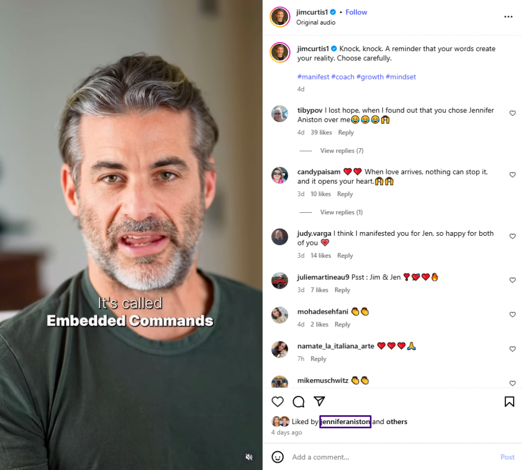 Džim Kertis nije običan lajf kouč; dečko Dženifer Aniston je hipnotizer specijalizovan za rad s podsvesti, balansiranje nervnog sistema i transformaciju životnih šablona. Na društvenoj mreži Instagram, Kertisa prati više od pola miliona ljudi, a njegove motivacione poruke privlače pažnju širom sveta.