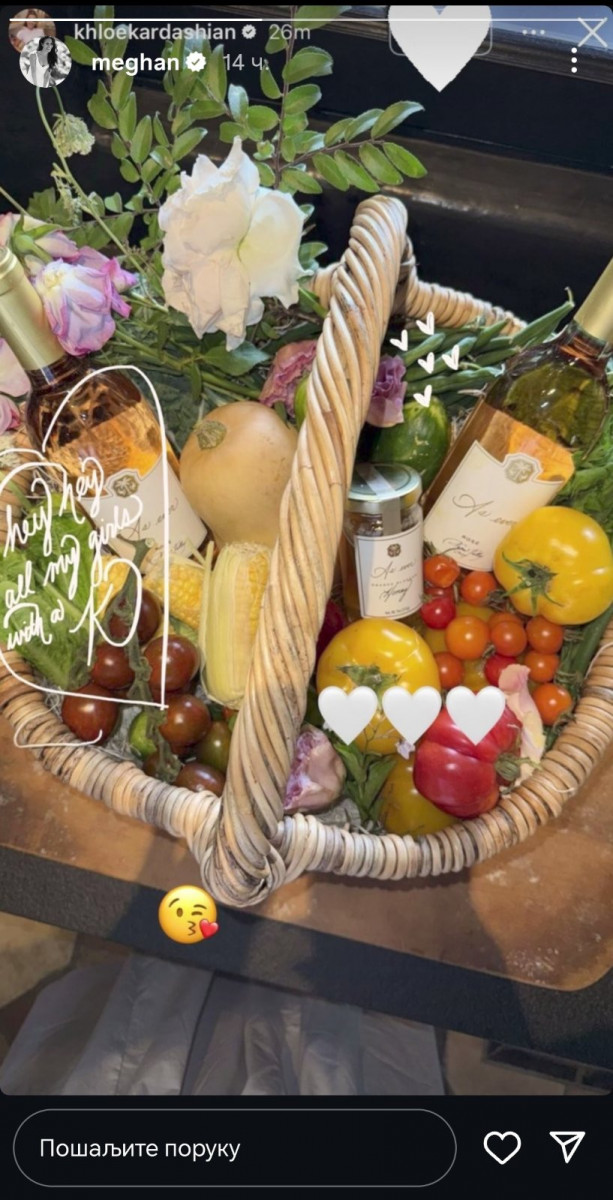 Na Instagram storiju, Megan je podelila fotografiju korpe ispunjene slatkim paprikama, kukuruzom, bundevom, raznobojnim cvećem, dve boce rose vina As ever rosé i teglom meda istog brenda. Uz fotografiju je dodala emotikone belih srca i poruku: „Hej, hej, sve moje devojke na K“.