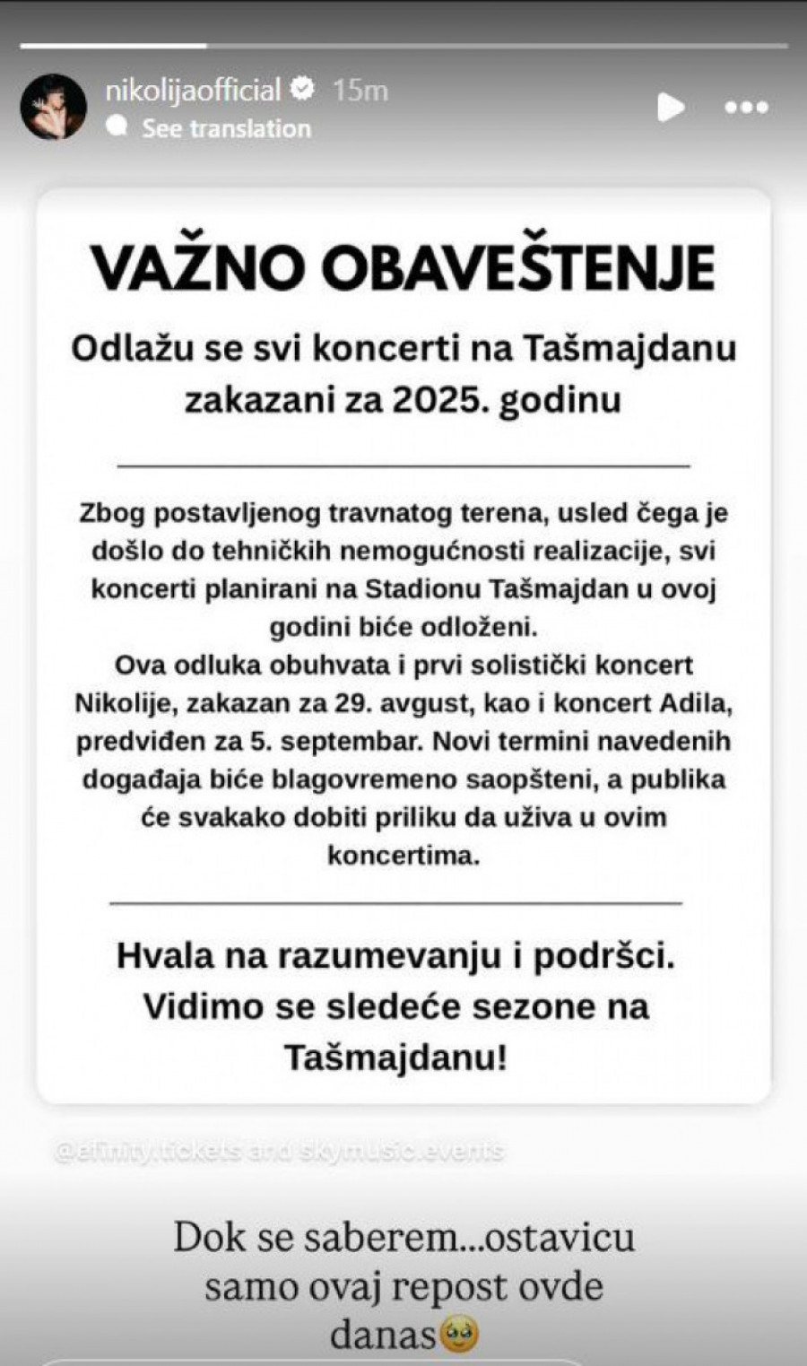 - Važno obaveštenje! Odlažu se svi koncerti na Tašmajdanu zakazani za 2025. godinu. Zbog postavljenog travnatog terena, usled čega je došlo do tehničkih nemogućnosti realizacije, svi koncerti planirani na Stadionu Tašmajdan u ovoj godini biće odloženi. Ova odluka obuhvata i prvi solistički koncert Nikolije, zakazan za 29. avgust kao i koncert Adila predviđen za 5. septembar. Novi termini biće blagovremeno saopšteni, a publika će svakako dobiti prilike da uživa u koncertima. Hvala na razumevanju i podršci vidimo se sledeće sezone.