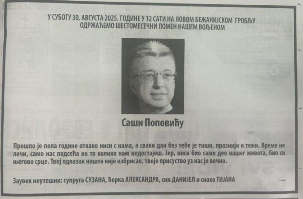 "Obaveštavamo rodbinu, prijatelje i sve drage ljude da će se u subotu, 30. avgusta, na Novom bežanijskom groblju, održati šestomesečni pomen  u znak sećanja na našeg voljenog Sašu Popovića. Parastos će početi u 12 časova, a službu će obaviti sveštenik Srpske pravoslavne crkve. Pozivamo sve koji žele da mu odaju poštu da nam se pridruže u molitvi i svi zajedno podelimo trenutke sećanja."